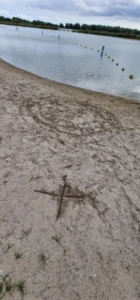 We doen een oefening, de cirkel van zelfbehoud. De titel vertel ik haar niet direct. Ik vraag haar in het zand een cirkel om zich heen te trekken met een stok. In de cirkel vraag ik haar drie fijne eigenschappen van zichzelf op te schrijven. Dat doet zij. Ze schrijft de voorletters van die eigenschappen in het zand.